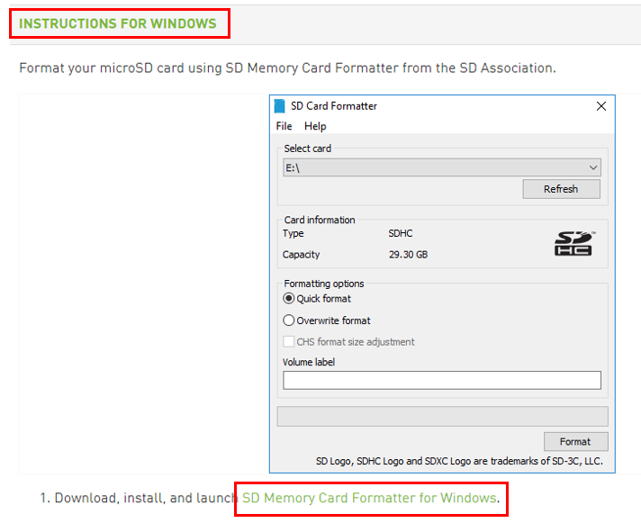 2-1. Click INSTRUCTIONS FOR WINDOWS and download "SD Memory Card Formatter for Windows".