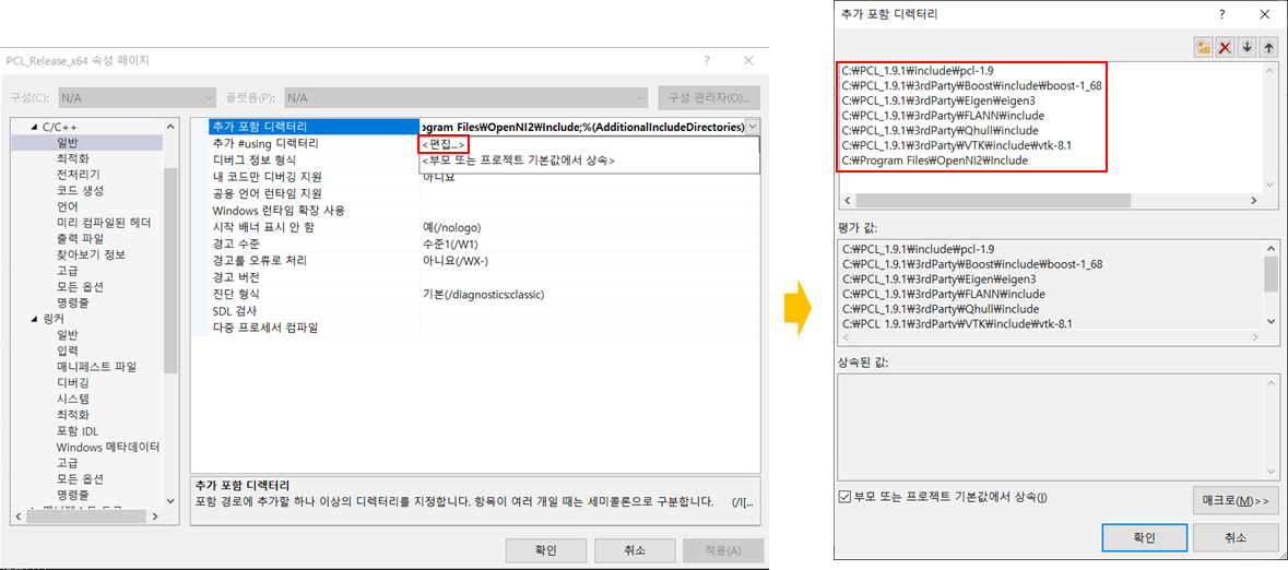 - 이후, PCL과 3rdParty의 include 폴더를 모두 추가해주세요. (경로는 버전에 따라 상의할 수 있습니다.)