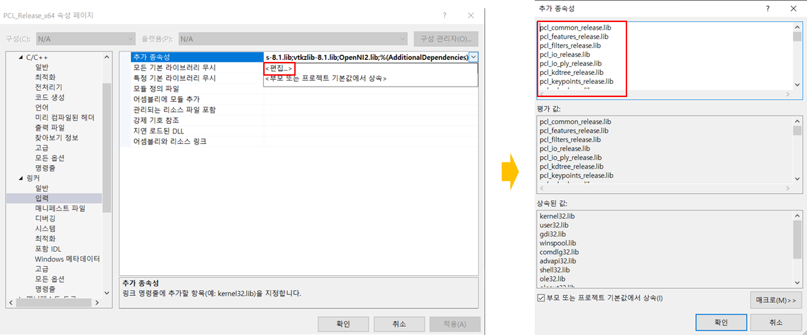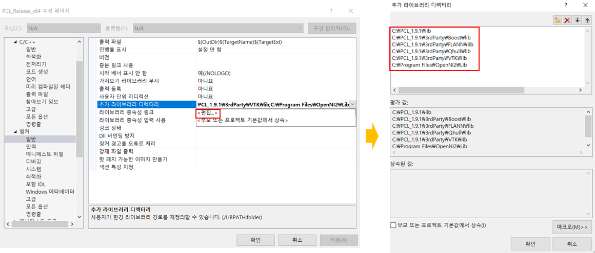 - 이후, PCL과 3rdParty의 lib 폴더를 모두 추가해주세요. (경로는 버전에 따라 상의할 수 있습니다.)