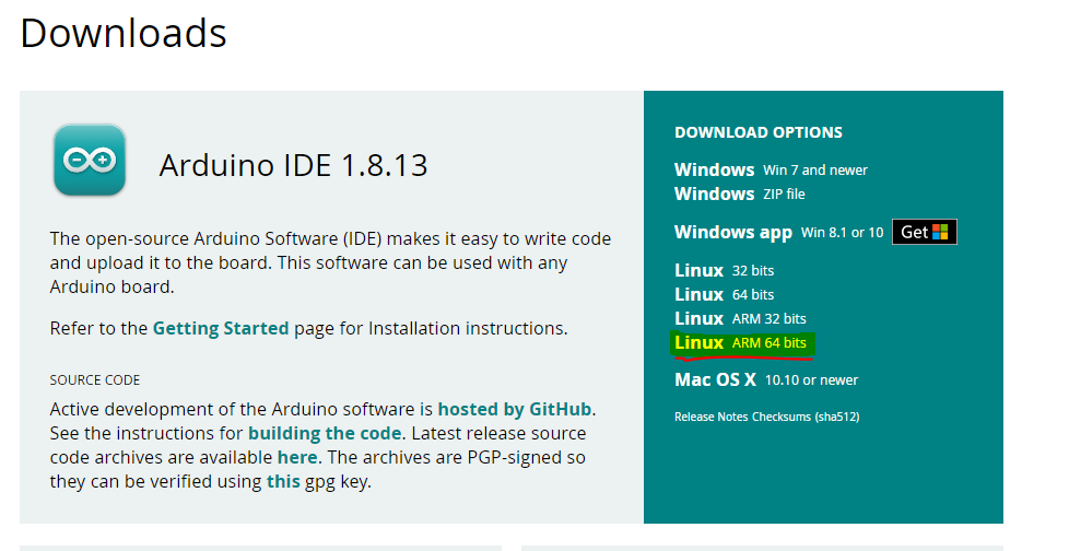- 먼저 아두이노 홈페이지로 이동하여, Linux ARM 64 bits용 설치파일을 다운받아줍니다. (Jetson Nano는 ARM 64bits 기반입니다.)